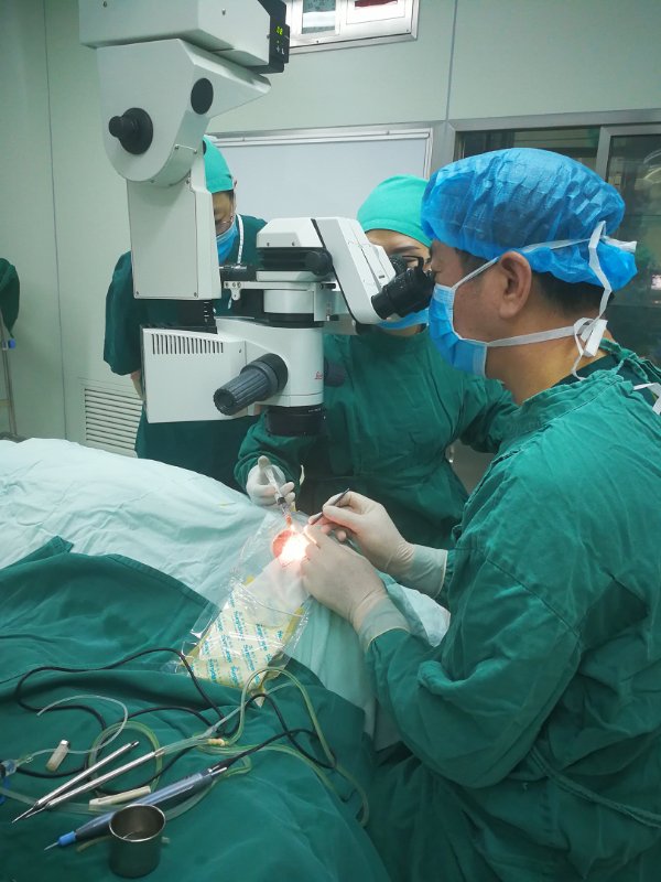 经过充分的术前讨论和准备,在入院后的第三天下午,王一心主任为邢老伯实施了右眼手术。王主任在手术过程中十分小心谨慎,尽量减少对眼内组织的损伤和干扰,防止晶状体悬韧带进一步断裂。在白内障摘除后,王主任惊喜地发现老伯的右眼还有条件植入人工晶状体,立即应用娴熟的技术,为老伯植入了备用的人工晶状体,手术过程顺利。