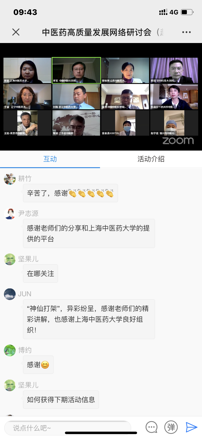 本次网络研讨会上,优才培训班第四期班长首先介绍了开展此次网络研讨会的背景、意义和流程。在“学术研讨”环节,来自赴鄂抗疫一线的英雄优才学员们围绕“新冠肺炎危急重症患者的中医药诊治经验分享与思考”主题作分享。国家中医药管理局高级专家组成员、中国中医科学院西苑医院苗青教授,是国家中医药管理局派出的第一批国家中医医疗队队员,奔赴湖北武汉战“疫”68天,主讲《重症COVID-19的中西医结合治疗探讨》;辽宁中医药大学于睿主任医师,是辽宁第一批援襄医疗队中的唯一一位中医专家,在湖北襄阳战“疫”39天,主讲《运用“肺—津—络”思路诊治COVID-19重症患者的临床体会》;华中科技大学同济医学院附属协和医院西院抗击肺炎中医组组长陈瑞教授,是一位武汉籍医生,至今奋战在抗击新冠肺炎疫情一线,主讲《“通补三焦”在COVID-19危重型患者治疗中的运用》;来自浙江省杭州市中医院的湖北籍医生陈启兰主任医师,作为杭州援汉医疗队中医专家,在援汉抗疫期间担任了同济医院光谷院区E1-4病区副主任,援汉战“疫”50天,主讲《从舌象看重型COVID-19患者的证候演变》。通过四位学员的分享,从不同的诊治角度和思考体会,为海内外观众带来了来自湖北抗击新冠肺炎疫情一线的最直接、最有说服力的诊疗经验,中医药学术氛围浓厚,诊治案例分析具有较高的临床价值。学术研讨和提问互动分别由中国中医科学院广安门医院李军教授、浙江中医药大学附属第一医院刘强教授、山东中医药大学宋咏梅教授、江苏省中医院常诚教授等四位优才学员主持。网络直播持续两个半小时,受到来自海内外的专家、学者、学生和医疗同道近3万余人的关注和支持,直播过程中观众们在互动区发言活跃,纷纷留言表达对我校开展抗疫专题学术直播活动的期待,也为后期不同主题层次的网络研讨活动打下了良好的基础。