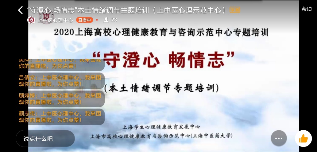 “守澄心,畅情志”本土情绪调节专题培训为2020上海高校心理健康教育与咨询示范中心项目,旨在提升一线学生工作者、心理教师业务知识和专业水平,有助于上海高教与普教学生工作的联动,促进优质资源共建共享,推动本土情绪调节探究与心理健康工作。我校将以此次培训为开端,持续挖掘与传播中国传统文化中心理学资源,打造中医心理特色,进一步提升心理育人质量,在心理健康教育队伍建设、教学实践、科研研究及体制机制完善方面展开积极探索。(心理咨询与发展中心)