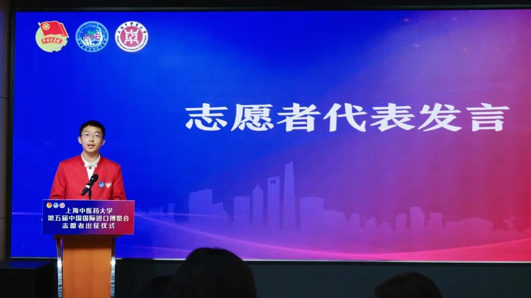 第五届中国国际进口博览会开幕在即,上中医“小叶子”5.0再次集结,准备出征!10月21日,上海中医药大学第五届中国国际进口博览会志愿者出征仪式在学校大学生创新创业实践园举行。今年是学校连续第五年派出“小叶子”们参与进博会的志愿服务,他们已蓄势待发、集结完毕,将以热情的服务、自信的面貌、向上的姿态,服务进博,展示上中医青年的青春风采。校党委副书记、副校长朱惠蓉,党委校长办公室、学工部(研工部)、保卫处、后勤保障处、宣传部(党委教师工作部),以及相关学院负责人等出席活动。