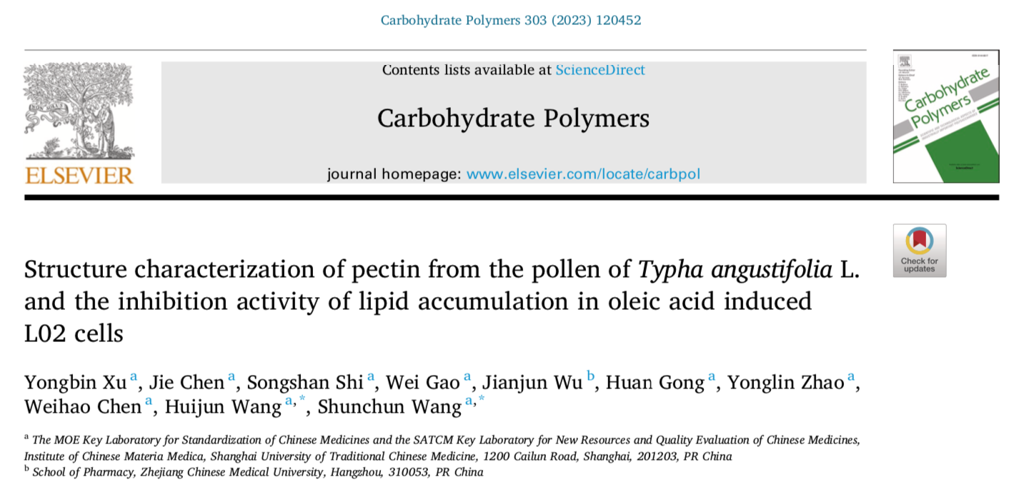 近日,我校中药研究所王顺春和王辉俊团队在化学一区TOP期刊Carbohydrate Polymers发表揭示中药蒲黄中RG-I型果胶多糖在降脂作用方面的最新研究成果Structure characterization of pectin from the pollen of Typha angustifolia L. and the inhibition activity of lipid accumulation in oleic acid induced L02 cells,该论文从中药蒲黄中提取得到一种新的RG-I型果胶多糖,并在油酸诱导的L02细胞模型中研究发现具有潜在的降脂作用。