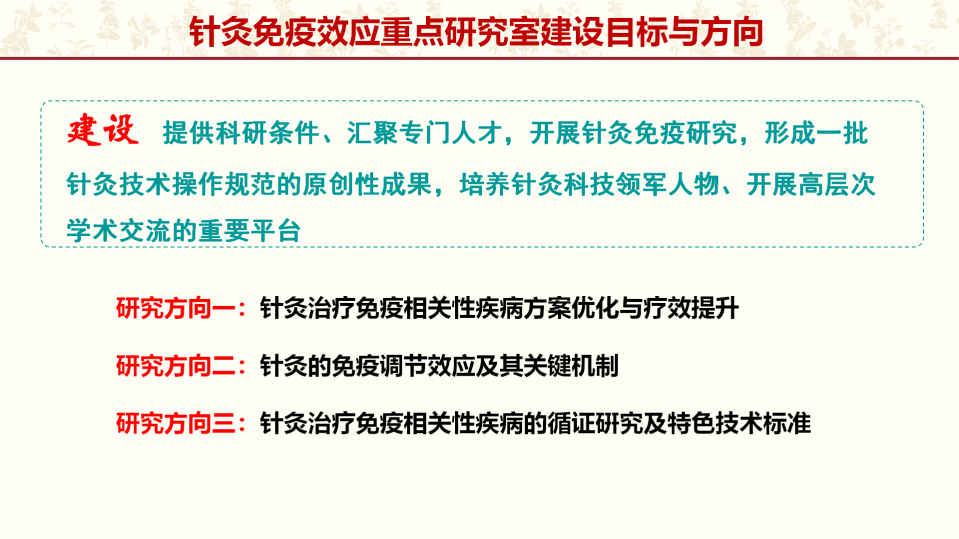 国家中医药管理局针灸免疫效应重点研究室自创建以来,在国家中医药管理局、上海市中医药管理局、上海中医药大学、岳阳医院、市针灸经络研究所等统一指导和协同管理下,瞄准针灸学科发展的关键科学问题,坚持以临床为基础,以人才培养为核心,以提高针灸临床疗效为目标,聚焦针灸治疗免疫相关性疾病特色技术与关键机制研究,促进中医药传承创新发展,并在制度建设、平台建设、人才培养、团队建设、技术推广等方面,取得了阶段性成果,力争建设成为国内领先、世界有影响的针灸免疫效应重点研究室。