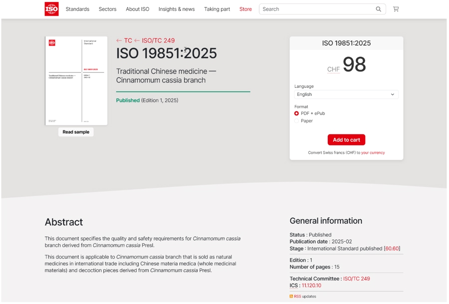 作为常见香料植物,肉桂的树皮是中外常用香料,而它们的枝条则被称为古代经方第一药。近期,《中医药—桂枝》国际标准(ISO19851: 2025 Traditional Chinese medicine—Cinnamomum cassia branch),由国际标准化组织(ISO)正式发布。这是上海中医药大学中药学院研究团队主导、6个国家团队专家参与制定与发布的大宗中药材ISO国际标准。