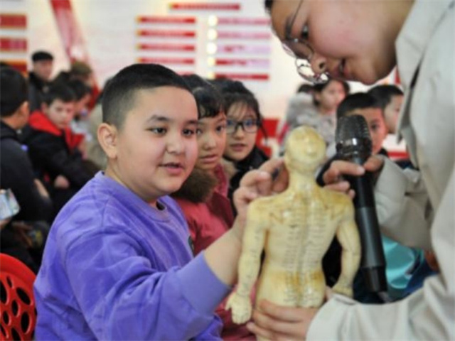 打造“讲”的队伍,在宣讲中激活传承基因。就此,上海中医药大学中医学院联合新疆医科大学维吾尔医学院开展一场别开生面的“中医药进社区”活动。“小朋友们看,脊柱就像小树苗,挺直才能茁壮成长!”在天山区二道桥街道固原巷社区,2024级中医学(五年制)学生俞悦手持3D脊柱模型,向小朋友们生动讲解了脊柱诊疗知识;博士研究生李元昊则带来了中医智能体质辨认仪,让居民们亲身体验了现代科技与传统中医结合的智能化成果。实践团还设计了“闻香识百草”“经络大闯关”等互动游戏,手把手地教孩子们认识穴位、练习八段锦。