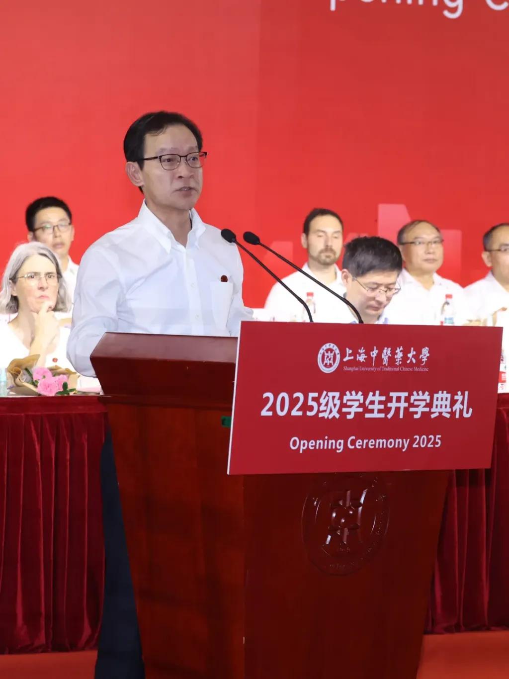 校长季光回顾了六十九年来上海中医药大学向着成为一所受人尊敬的大学砥砺前行,为中医药事业培养了数万名优秀人才,校友遍布70多个国家和地区,推动中医药文化从神州大地走向寰宇万家的光辉历程。他寄语全体新生,愿你们:以本草之谦逊扎根大地,在平凡中铸就非凡;以银针之灵动贯通古今,于守正中开创新境;以仁心之炽热照亮人间,用生命守护生命。愿我们共同书写的青春答卷,无愧“上中医人”之名,无愧这奔腾不息的伟大时代!