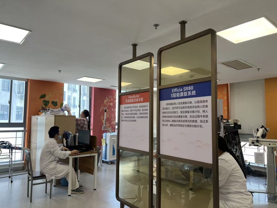目前“智联康复元诊疗”项目实体落地上海两家三级医院:上海中医药大学附属岳阳中西医结合医院、复旦大学附属华山医院。这其中,岳阳医院于2022年入选国家中医药管理局项目成为“国家中医康复中心”。近日记者走进近2000平方米的“国家级”中医康复中心,融合“智联康复元诊疗”建成的虚拟问诊中心、评定中心、康复训练中心和数据中心等颇为亮眼。