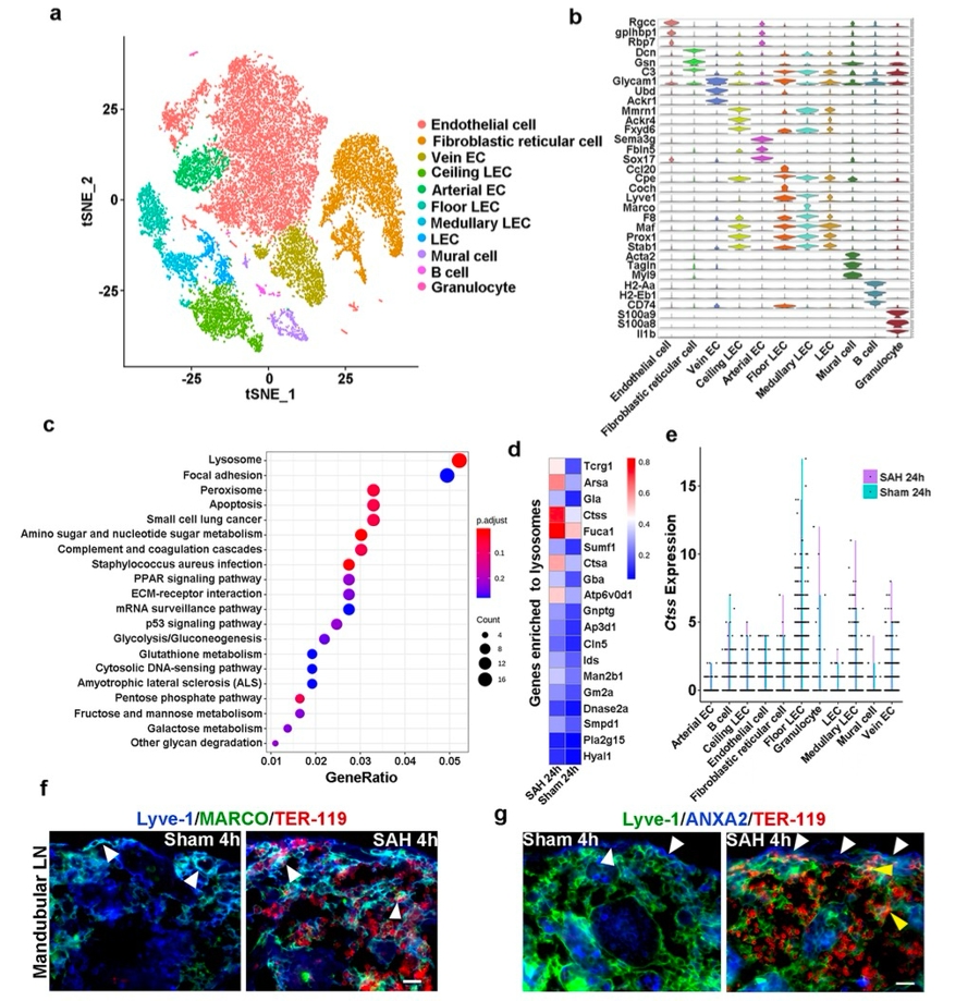 其三是找到核心靶点:对下颌淋巴结进行单细胞RNA 测序和免疫荧光分析后,团队发现SAH后24小时,血管外红细胞主要是被下颌下淋巴结髓窦LEC中的溶酶体蛋白酶S(CTSS)降解,以此显著减轻蛛网膜下腔出血后的神经炎症,并有效改善神经功能缺损。