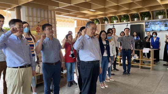 作为中国近代工业的发祥地,杨浦滨江见证了上海百年工业的发展历程。党员们以“初心的出发地”秦皇岛码头为首站,实地参观了秦皇岛码头党群服务站。秦皇岛码头原为黄浦码头,一百年前,包括周恩来、邓小平、聂荣臻在内的650余位留法勤工俭学学生从这里登船远航,踏上了寻求救国救民之路。百年后的今天,从这里再出发,缅怀革命先烈,追寻先辈的奋斗足迹,感受红色基因的历史传承。在讲解员的引领下,党员们通过沙雕版画、透明触控和语音播报,认真地观看和聆听毛泽东主席踏上追寻革命真理道路的红色故事。并在上海中医药大学终身教授、上海市名中医严隽陶老师的带领下,面向红色党旗,重温入党誓词,鞭策自己葆初心、善作为!