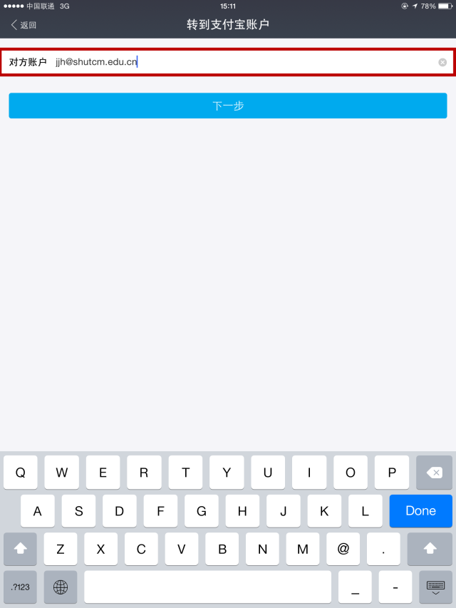 3. 输入基金会支付宝账户:jjh@shutcm.edu.cn ,点击“下一步”