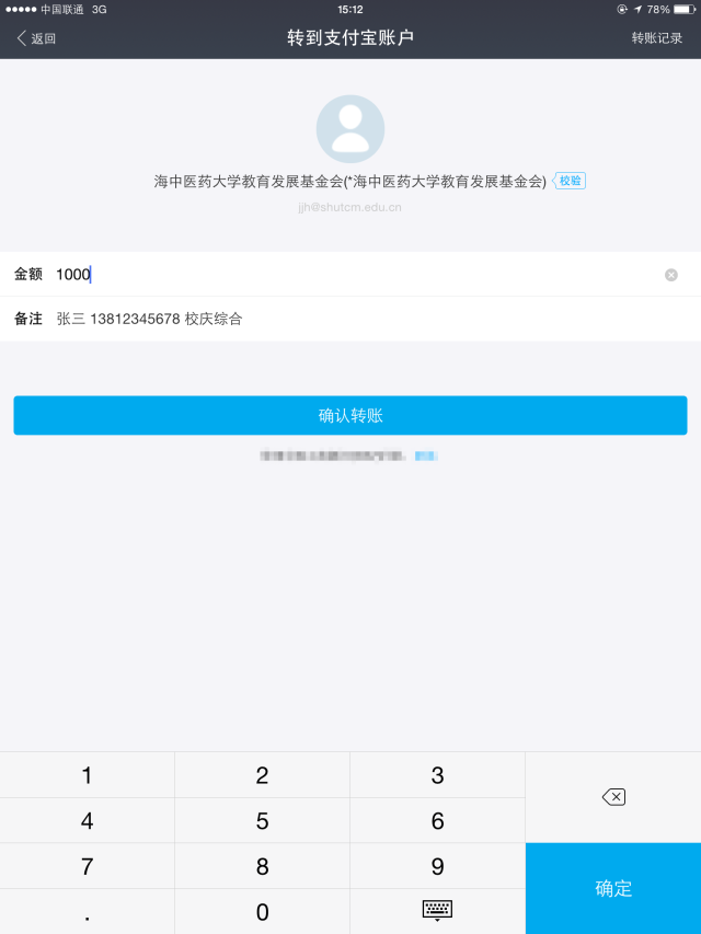 4. 转账页面会自动跳出“上海中医药大学教育发展基金会”,输入捐款金额,并在备注中输入“姓名+联系电话+捐赠用途”,点击“确认转账”,输入您的密码即可。