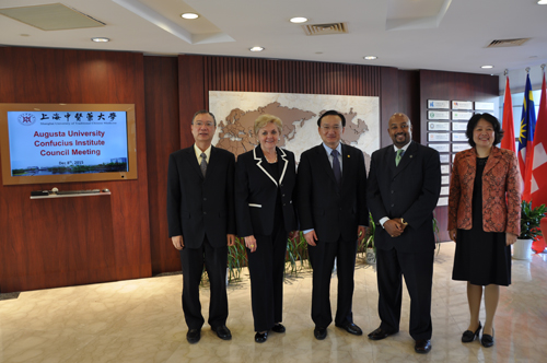 月8日上午,2015年度奥古斯塔大学(原佐治亚瑞金斯大学)孔子学院理事会在国际交流合作中心召开。我校校长徐建光、副校长施建蓉,奥古斯塔大学副校长Quincy Byrdsong、孔子学院外方院长Cindi Chance和中方院长周文新作为理事会成员出席会议。我校国际交流处处长郑林赟、国际教育学院副院长赵海磊参加会议。