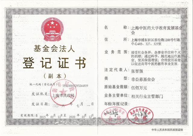 经上海市社团管理局审批,上海中医药大学教育发展基金会于今年4月19日顺利通过了2016年度检查。基金会竭诚感谢社会各界及诸位爱心人士的支持!