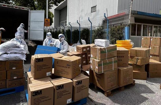上海医药总部是上海防疫物资保障单位。面对严峻复杂的疫情形势,医药总部不断收到来自社区、医院、集中筛查隔离点的防疫物资保障需求。截止目前,防疫物资保供团队已累计派送新冠抗原检测试剂盒三万余份、外科口罩、防护服及隔离衣、手套、鞋套、面屏、消毒湿巾、快速消毒液等防疫物资近千箱,多次出色地完成各级组织的疫情物资保供工作。