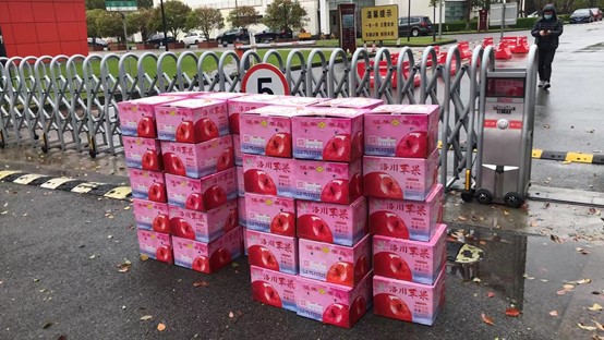 在九五公益的联络下,归农集团捐赠了红橙,上海羚佳创意了蓝莓汁,上海雅澳供应链捐赠了健康餐,安徽硒泰捐赠了富硒山泉水,上海尚南捐赠了苹果。由于大多企业不在上海,大家都冒着时间紧,运输不便等情况,克服种种了困难,最远从湖北恩施发货,现场采摘装箱,保证新鲜,两天内抢运进校园,让留校师生吃上了新鲜水果。