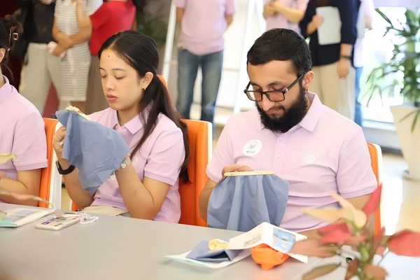 针脚细密,色调典雅,在苏绣活动板块,一幅幅绣工精湛、栩栩如生的刺绣作品吸引了国际学生们的目光。苏绣,被誉为“东方艺术明珠”,每一处细节都体现了东方匠人的精湛技艺与对美的极致追求。选线,穿针,刺绣,国际学生们在老师的指导下拿起绣针,尝试在方巾上绣出一片银杏叶,沉浸式感受江南文化的韵味。