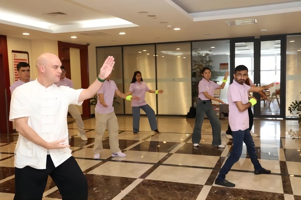 “太极拳体验”环节,国际学生们一展身手,在上海中医药大学美国籍留学生周安的带领下缓缓起势,一招一式间,体会“以柔克刚”“四两拨千斤”的武学智慧。同济大学巴基斯坦籍学生泽山说道:“我一直对中国武术十分向往,今天是第一次体验太极拳,感觉很有意思,以后我准备把它加到我的健身运动当中。”