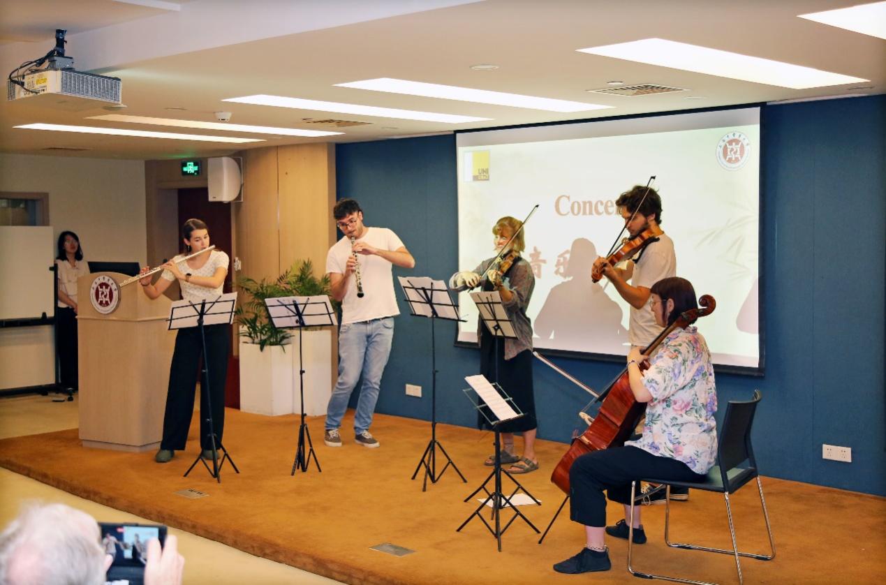 在国际交流合作中心,两校共同举办了中奥大学生音乐欣赏交流会。会前,钟力炜与Peter Riedler分别致辞。我校民乐团成员在音乐会上精彩演绎了《盛世国乐》《茉莉花》《兰亭序》等经典曲目,用英语向外方师生介绍了民乐团以及二胡、中阮、竹笛、古筝、大鼓的特色,反响热烈。格拉茨大学乐团代表亦献上《小夜曲》《美丽的迷迭香》等优美动听的经典管弦重奏,令现场师生赞叹不已。音乐会上,双方学生不仅展示了音乐才华,更增进了对彼此文化的理解。