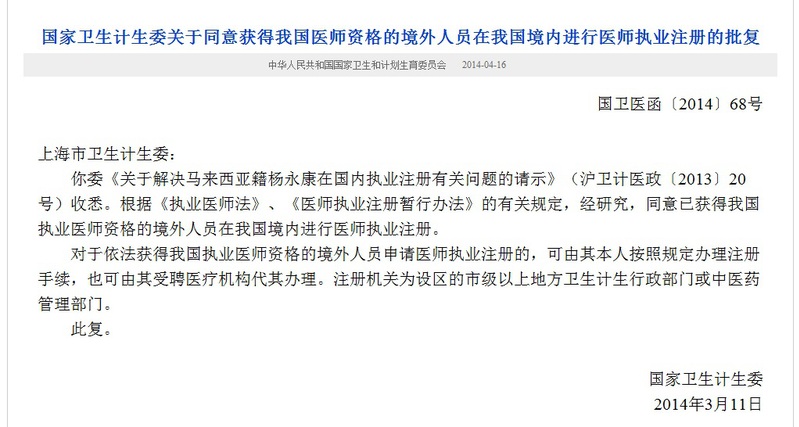 国家卫生计生委关于同意获得我国医师资格的境外人员在我国境内进行医师执业注册的批复