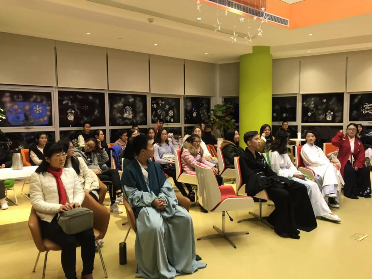 在有螺旋楼梯和美丽环灯的大报告厅里,来自全世界各个地区的中医药学子汇聚一堂,活动参与者包括国际教育学院的老师与学生,以及逐风诗社与茶艺社的同学还有受邀而来的中国同学,共有41位。本次活动由一名国际学生和中国学生搭档主持,活动开始主持人讲述本次活动的背景,引出诗词里的人生,学生们从“童年”、“青年”、“中年”、“老年”等不同人生阶段向我们细细讲述鉴赏中国诗词中的美好人生意趣。在“诗词属性猜猜猜”和“看图猜诗”的游戏环节中,学生们积极举手抢答,答对的同学得到了精心准备的小奖品,现场气氛达到了高潮。在“飞花令”的诗词游戏中,两名女同学给大家呈现了两场精彩的成语接龙。接着由来自茶艺社的两位同学献上茶艺表演,大家饶有兴致地欣赏着茶艺表演,品味着同学沏出来的清茶,谈笑风生。第二期的“诗词会友”活动就在一个轻松愉快的氛围下圆满结束。