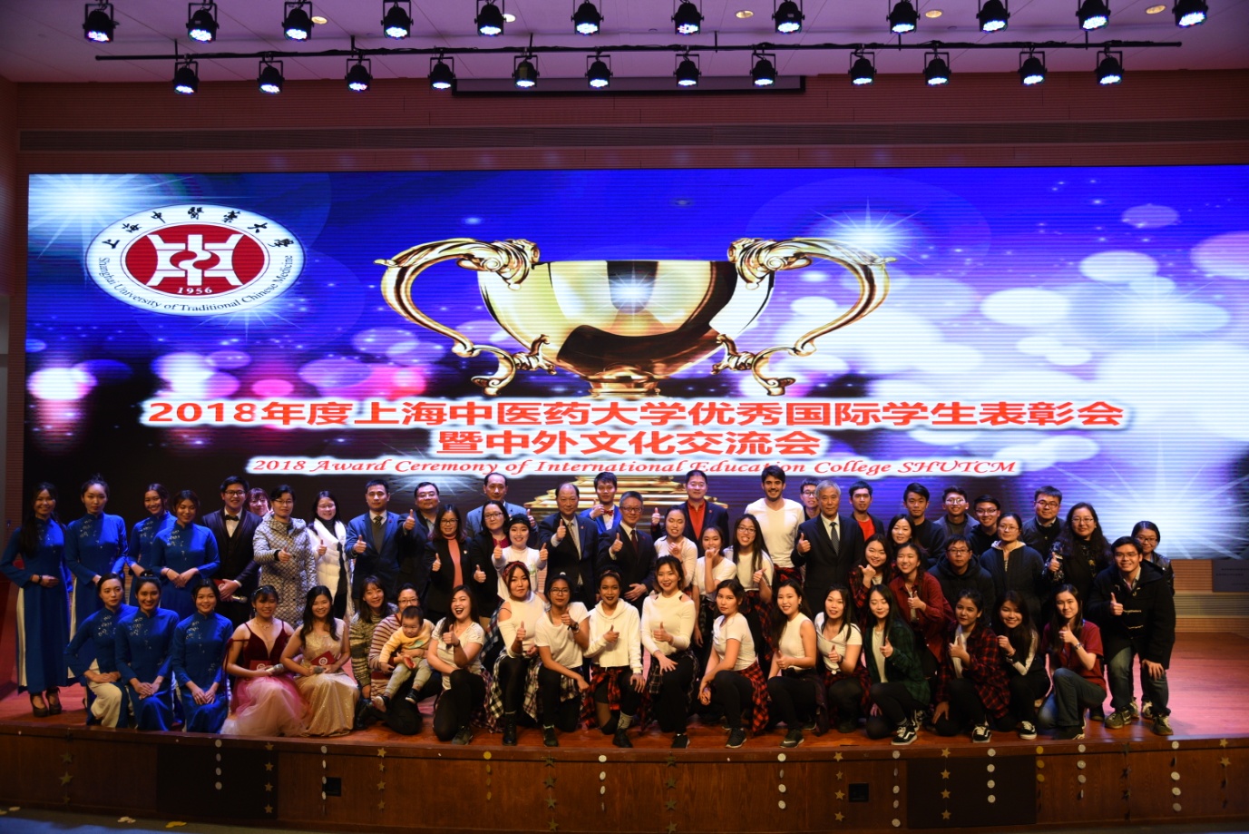 2019年1月10日晚,“不忘来时路,传承中医魂”2018年度上海中医药大学优秀国际学生表彰会暨中外文化交流会在图书馆裙楼四楼报告厅圆满落幕。党委学(研)工部、教务处、研究生院、护理学院、公共健康学院领导,国际教育学院领导、各部门主任和教师代表,以及学校金牌教师张黎声教授和郭春霞老师出席此次表彰会。