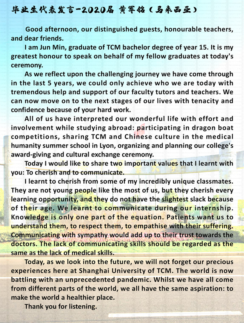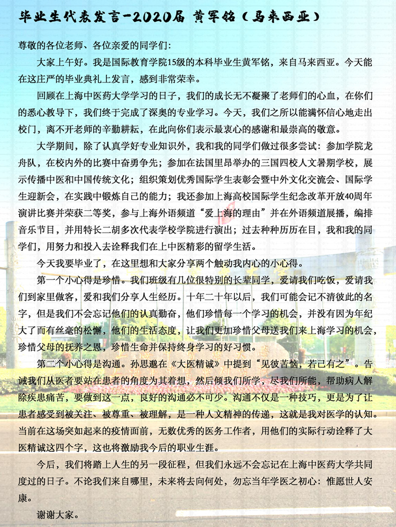 毕业生代表发言-2020届 · 黄军铭(马来西亚)