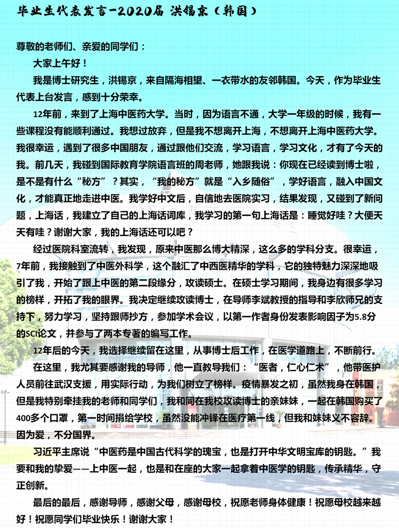 毕业生代表发言-2020届 · 洪锡京(韩国)
