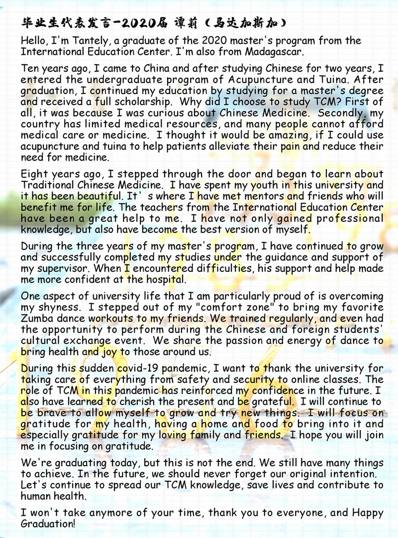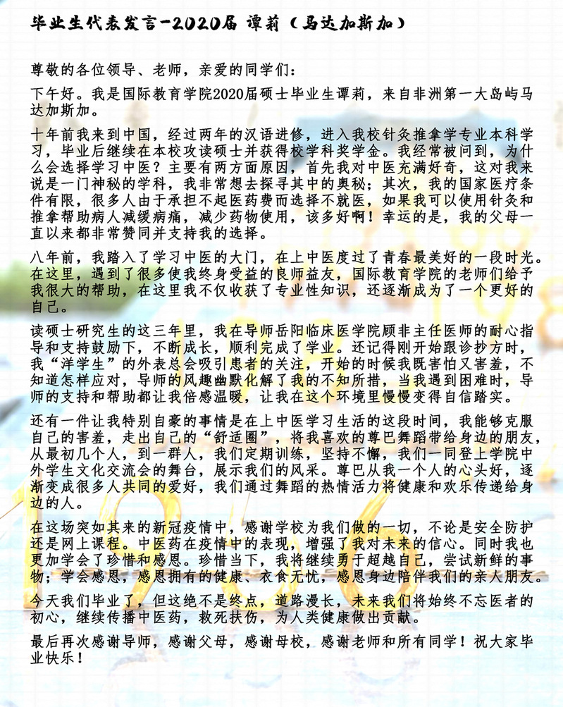 毕业生代表发言-2020届 • 谭丽(马达加斯加)