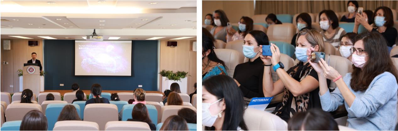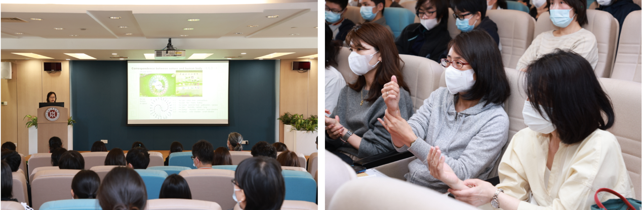 “Know your body”讲座中,来自上海中医药大学附属曙光医院的副主任医师李熠萌从顺应天时的角度,向在场的国际学生讲解了子午流注经络养生,又介绍了几个自我穴位保健按摩方法,并耐心地教授如何准确地定位按摩穴位,这些简易实用的养生方法吸引了国际学生的极大兴趣。
