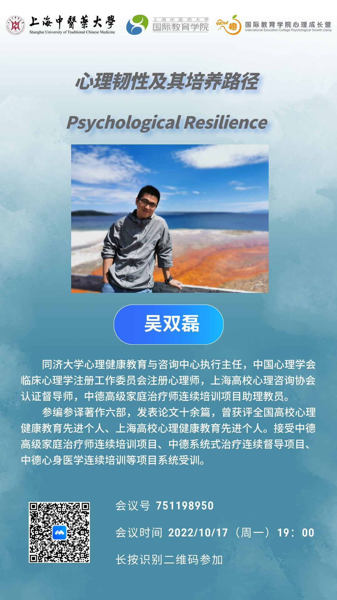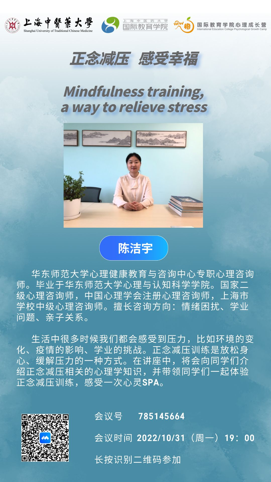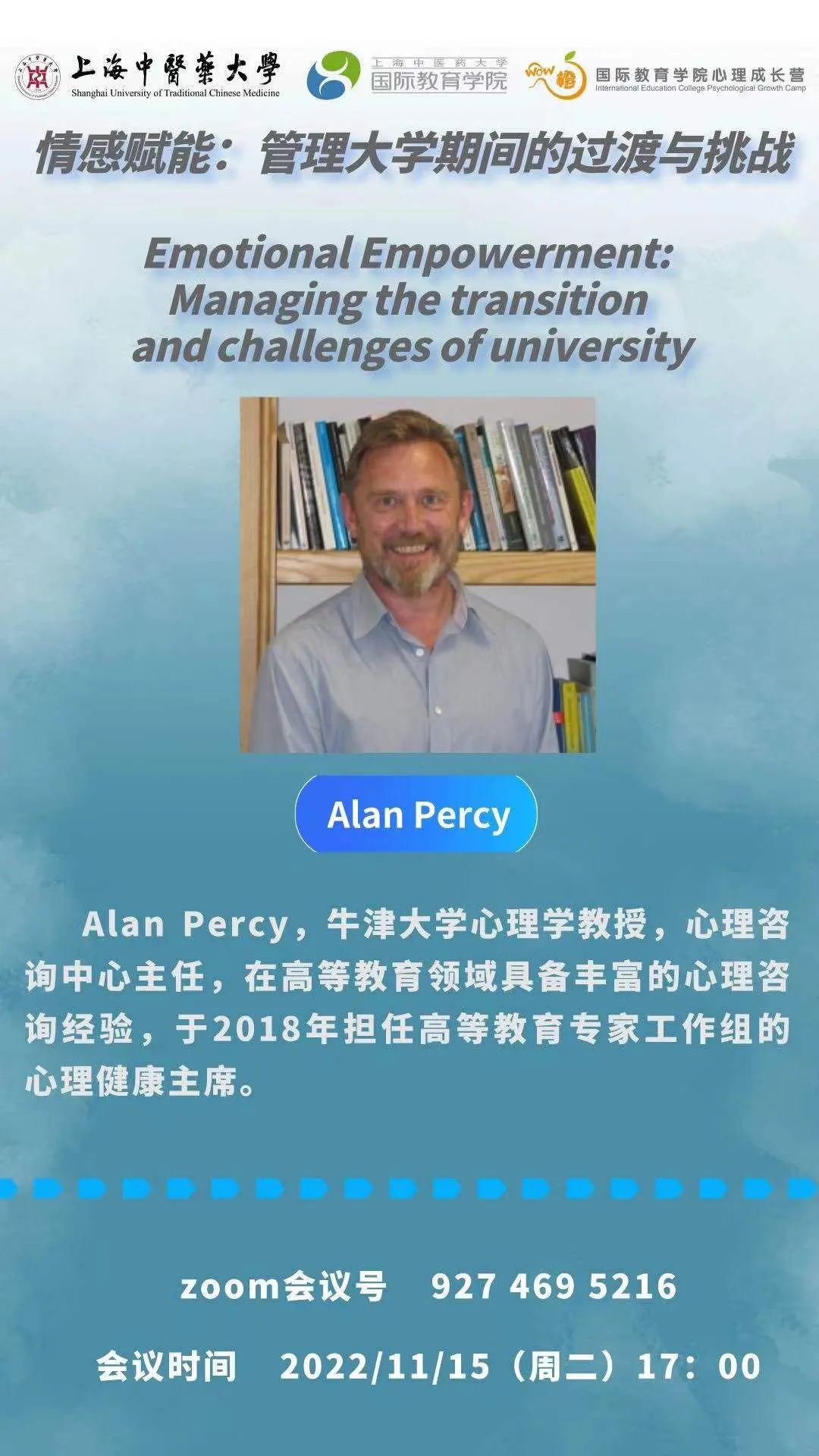 2022年10月至11月,上海中医药大学国际教育学院“WOW橙”心理成长营举办了三场心理学讲座,分别由同济大学心理健康教育与咨询中心执行主任吴双磊、华东师范大学心理健康教育与咨询中心专职心理咨询师陈洁宇、牛津大学心理健康教育与咨询中心主任Alan Percy主讲,为全院师生呈现一场心理学盛宴。每场讲座中,近百余名师生围绕心理学专业问题参与讨论。