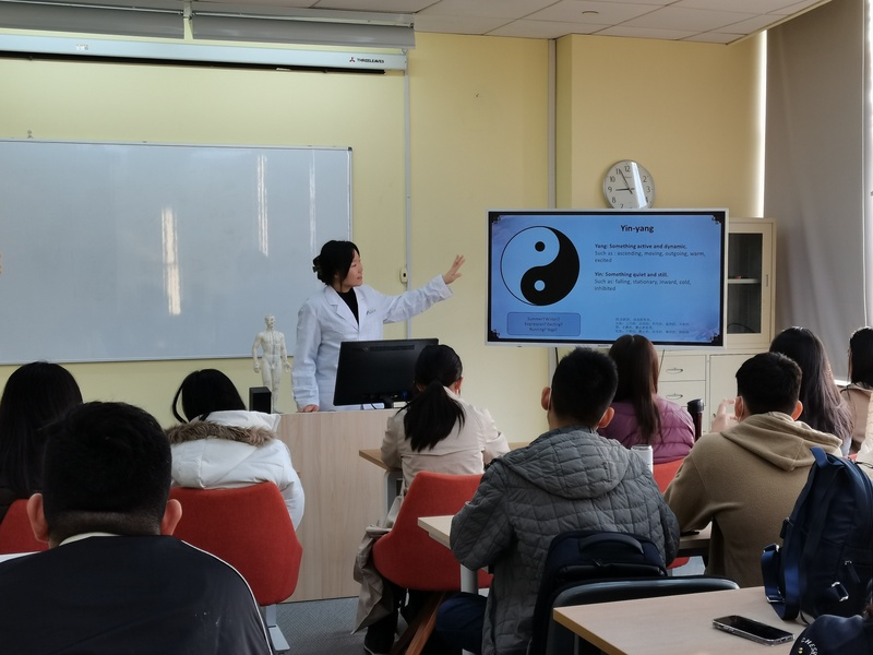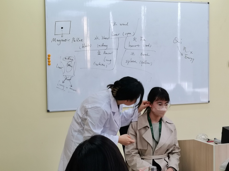 在中医文化讲座中,学生们学习了简单的中医基础理论、中医诊断与多元化的治疗方式,并在互动环节,积极体验耳穴贴和穴位按摩。