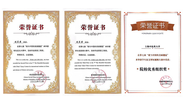 日前由教育部留学服务中心举办的2023年第七届“我与中国的美丽邂逅”来华留学生征文暨短视频大赛颁奖活动在北京举行,我校2019级中医学专业马来西亚籍本科生刘芷君获征文大赛二等奖,短视频大赛三等奖,上海中医药大学获院校优秀组织奖。
