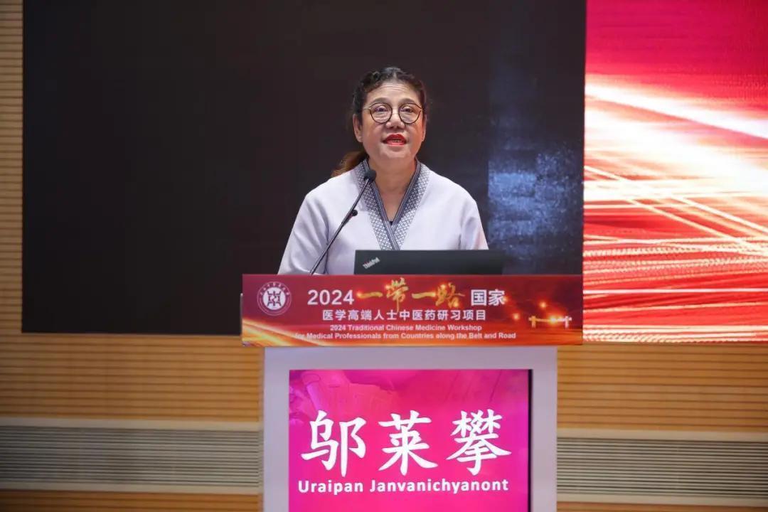 泰国华侨崇圣大学校长邬莱攀作为研习班学员代表发言。她回顾了与上海中医药大学20余年的合作历程,双方共同创办的泰国首个中医学本科专业,现已为泰国中医药行业培养了近千名人才,有力提升了中医药在泰国和东南亚的服务能力。