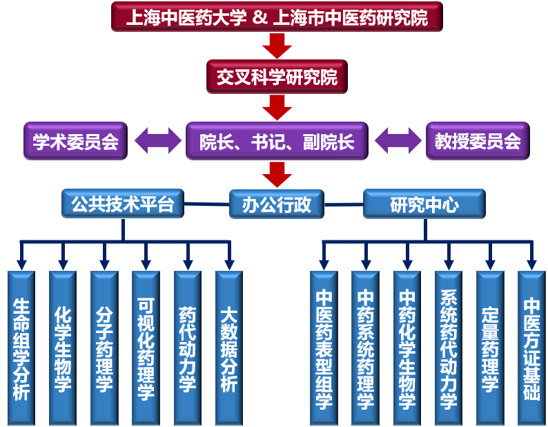 上海中医药大学交叉科学研究院于2016年成立。研究院建立伊始就致力于中医药学与生命医学相关学科的交叉融合,旨在通过发挥多学科交叉和人才聚集优势,打造面向国际、国内一流的中医药多学科交叉和生物医学前沿的系列研究平台。研究院围绕国家重大需求和国际生命医学领域前沿问题,立足中医药现代化与国际化的关键难题,加强中医药自主创新与国际合作,促进中医药学与生命医学相关学科的交叉融合,加快中医药基础研究向临床研究的转化和应用,为我国日益增长的全民健康服务需求做出重要贡献。