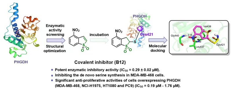 近日,我院田平课题组与中科院上海药物所黄敏课题组在生物有机化学国际著名期刊《Bioorganic chemistry》上发表研究论文“Identification of benzo[b]thiophene-1,1-dioxide derivatives as novel PHGDH covalent inhibitors”(DOI:10.1016/j.bioorg.2024.107330),通过化合物筛选、结构优化以及后续的生物机制研究,报道了一类靶向丝氨酸合成通路的关键限速酶PHGDH的新型共价抑制剂。