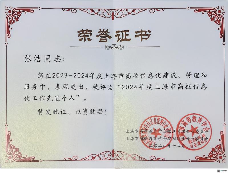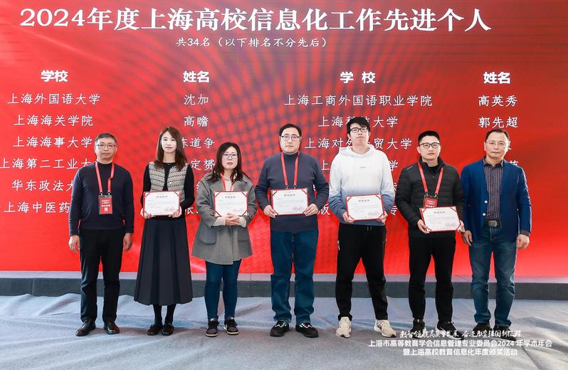 12月13日至14日,上海市高等教育学会信息管理专业委员会2024年学术年会暨上海高校教育信息化年度颁奖活动在上海闵行顺利举行,大会由上海市高等教育学会信息管理专业委员会主办,华东师范大学承办。大会以“数智领航高质量发展,奋进教育强国新征程”为主题,进行了多项学术汇报及广泛的学术交流。为鼓励在高校信息化建设、管理和服务中有突出贡献的先进个人,学术年会对“上海市高校信息化先进个人与信息化工作支持奖”进行了颁奖和表彰。信息办张洁同志被评为“2024年度上海市高校信息化工作先进个人”。