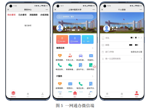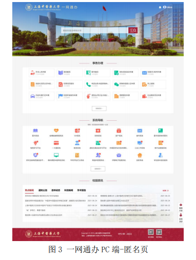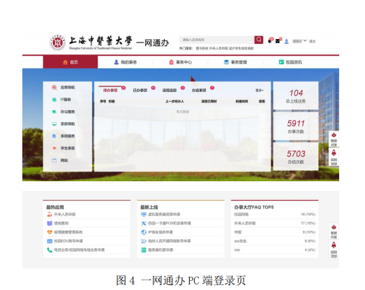 平台采用当前主流的融合服务门户建设模式,在梳理和优化业务流程的基础上可快速构建线上业务功能。一网通办目前有PC端和微信端两种访问方式,PC端已上线104项办事服务,集成25个业务系统;微信端已上线36项办事服务(更多业务在持续对接整合的过程中)。用户在校园网环境下可直接访问一网通办PC端和微信端;非校园网环境下需先登陆VPN进行访问。(VPN地址:https://vpn.shutcm.edu.cn,VPN账号和密码与统一认证用户账号相同)。