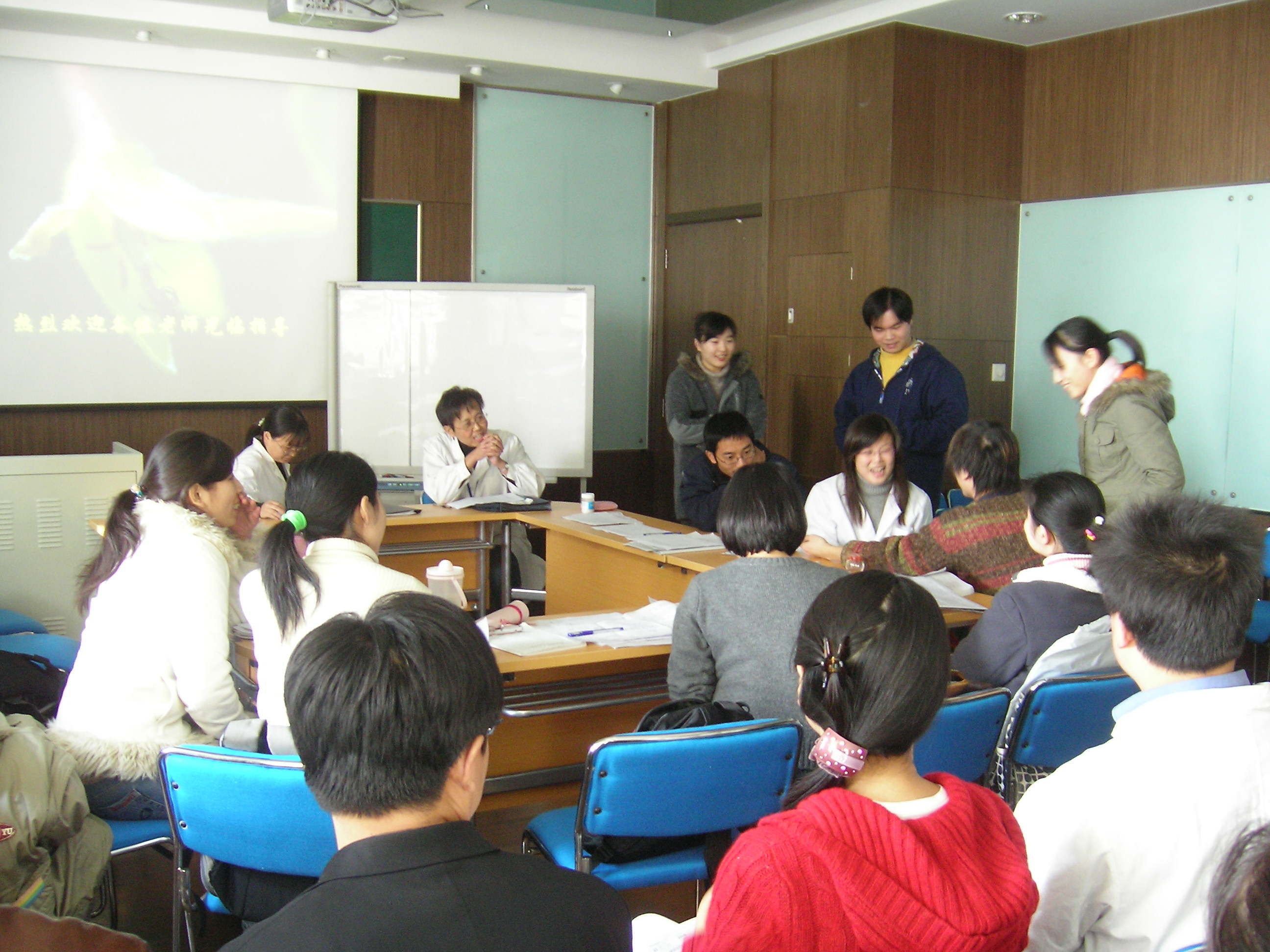 1:30公开课准时开始,班上同学被分成了两组,分别利用一节课时间先后对不同问题进行讨论。第一组同学首先以小品的方式直观地展示了一个运用中医传统“根结”理论治疗坐骨神经痛的病例,继而由小组长主持,围绕中医古典医籍的认识、现代临床实际运用及研究进行了讨论和发言、总结。第二组的讨论开始后气氛显得较为热烈,同学们对“巨刺”“缪刺”理论中某些问题产生了较激烈的争论,有些问题还被同学抛向了在一旁观摩的老师,争论甚至引得已结束讨论的第一组同学按捺不住举手发言。两组同学在整个讨论过程中,均有一位同学专事记录,并随时打印出记录内容。他们在讨论课结束时还按照徐老师的要求为另一组每位同学的表现进行了评价和打分。课堂上徐平老师和另一位辅助教师张翠红始终坐在同学中间,时而提出问题,时而加入讨论,时而引导讨论的进程或提示课后应注意学习的内容。同学们热情高涨、积极发言、敢于质疑、相互激励的表现以及引经据典、归纳资料的能力均给观摩者留下了很深的印象,很难想象内容难免枯燥的医经选读课能如此吸引同学、变得如此生动。