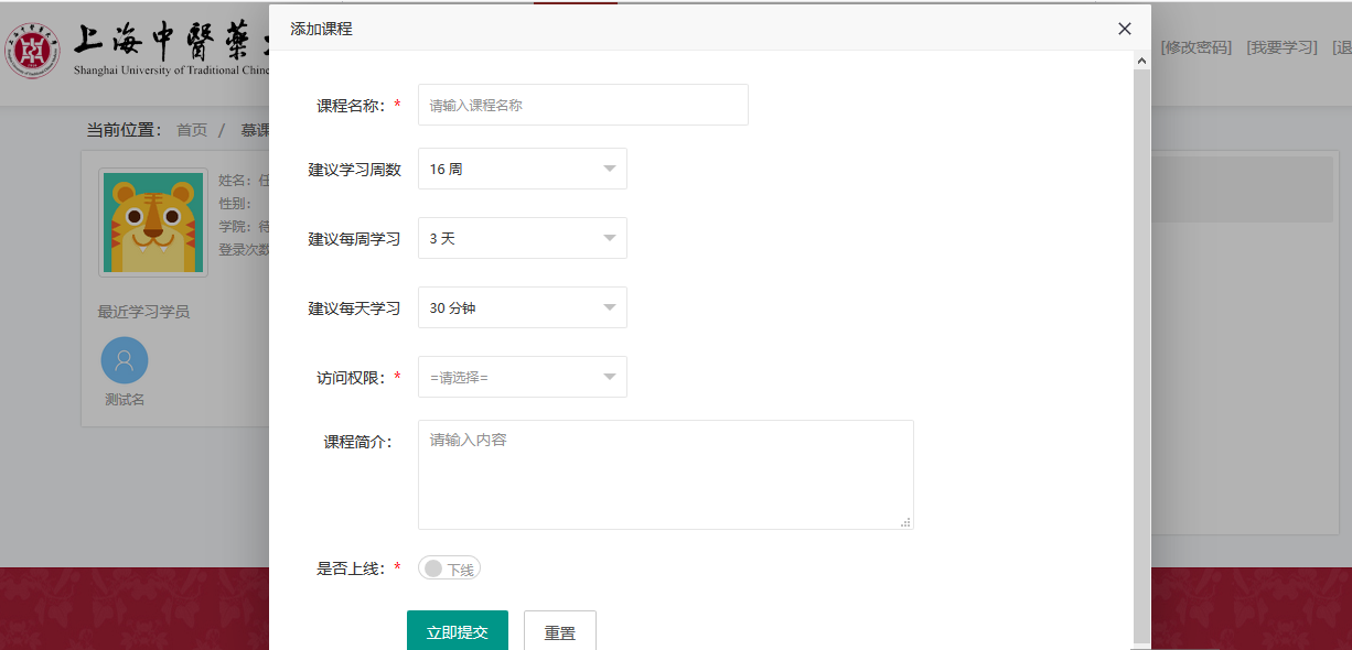 点击【添加慕课课程】按钮进入添加慕课课程界面,并按照系统界面填写相关信息。如下图所示:
