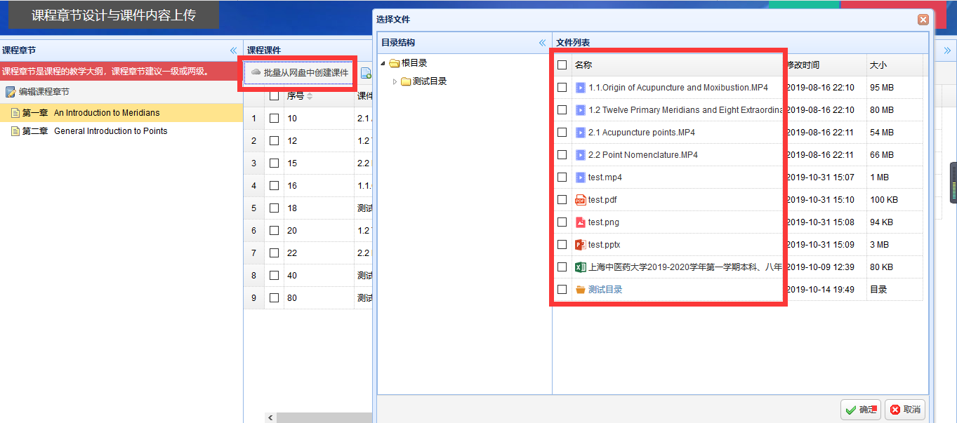 教师完成章节及知识点设计后,在同一个界面进行课件上传。系统中支持四种类型的课件:视频课件、Office课件、Pdf课件、网页课件。其中视频课件、Office课件、Pdf课件可以从“教师网盘”里直接选择,不需要重复上传。网页课件可以在线编辑。课件从网盘里选择页面如下图所示: