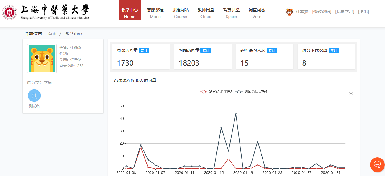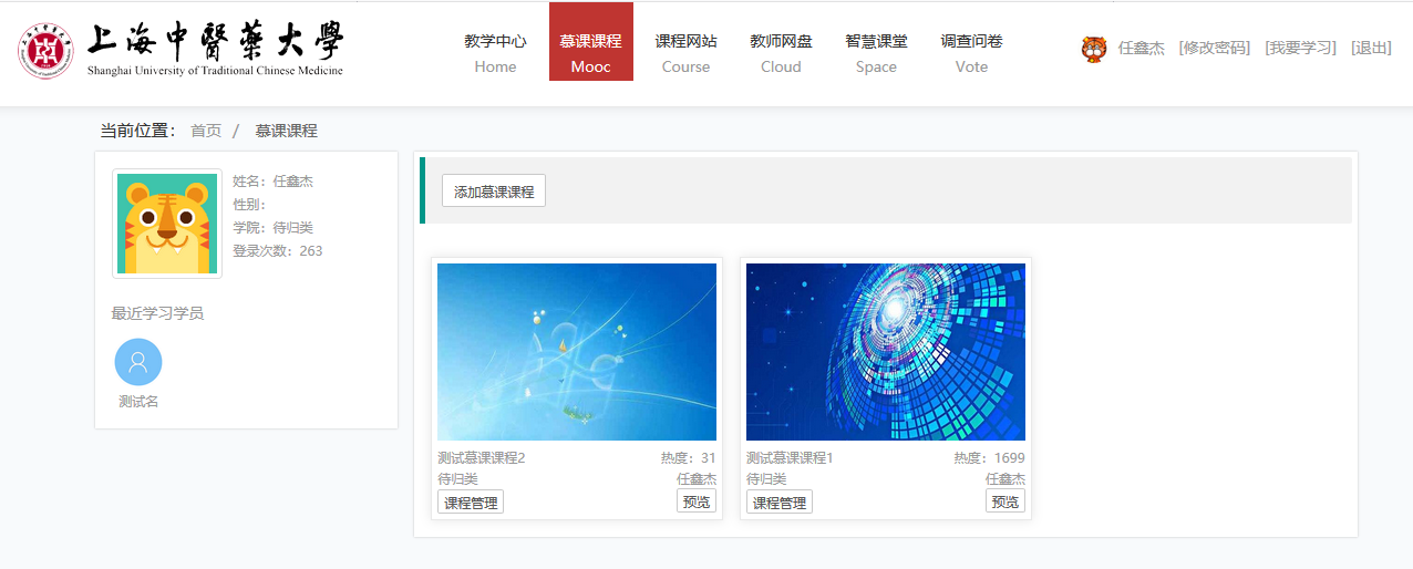 进入教学中心后,点击顶部菜单【慕课课程】链接,进入慕课课程模块。如下图所示: