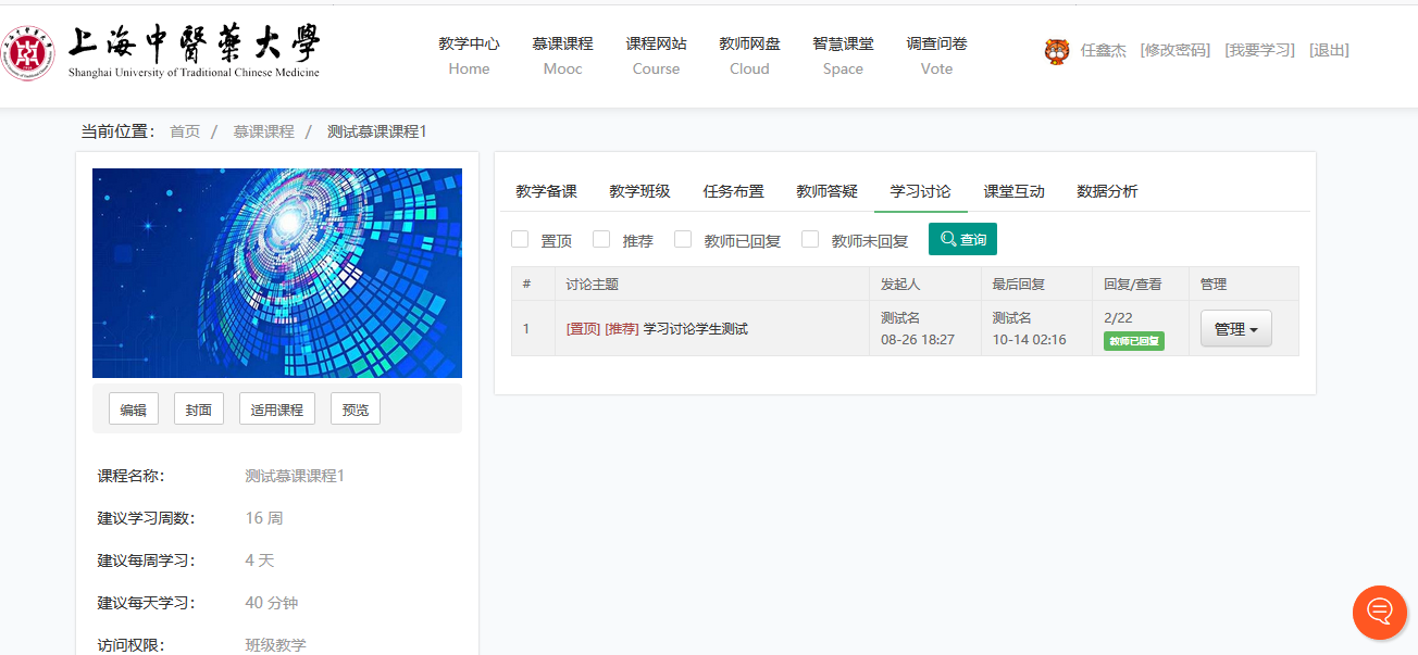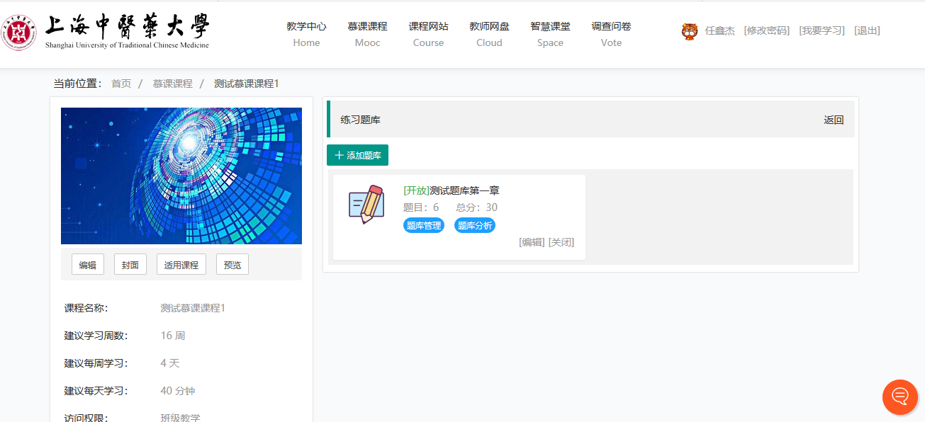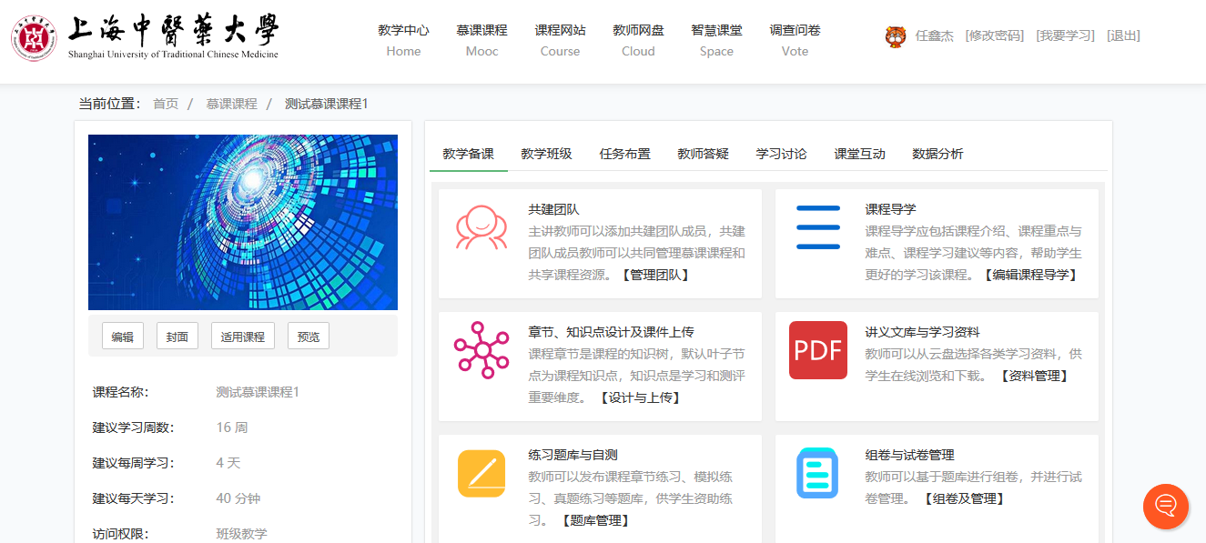教师创建慕课课程完毕后,点击慕课课程进入慕课课程首页,如下图所示: