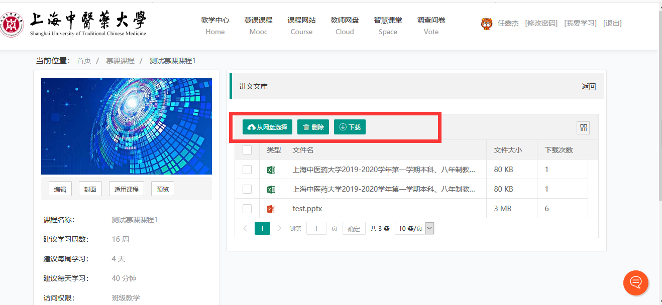 在备课模块下,教师可以上传各类讲义文库或学习资料提供给学生下载学习。所有学习资料需要先上传到网盘中,然后从网盘直接选取即可。如下图所示: