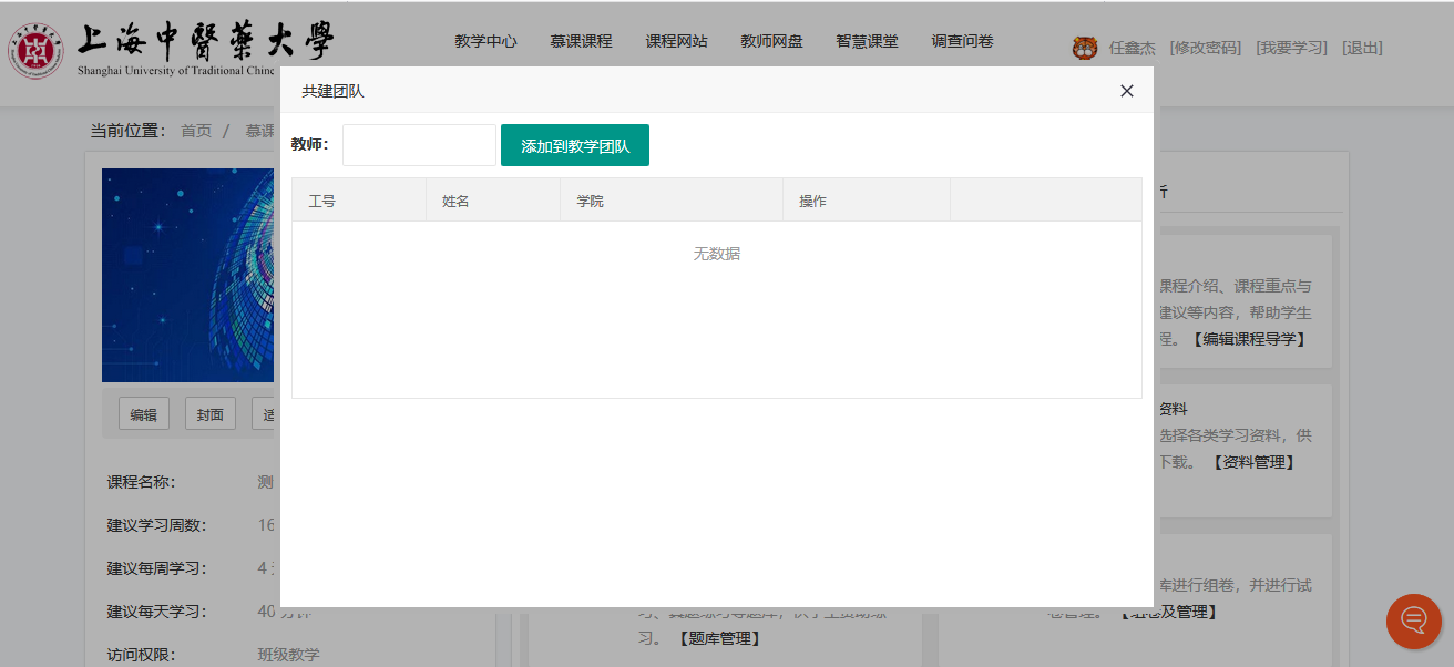 在备课模块下,教师可以添加自己的共建团队成员。共建团队成员和任课教师具备相同权限,可以共同完成课程建设。如下图所示: