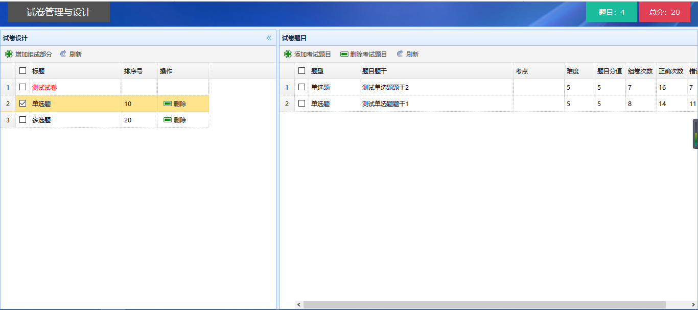 在备课模块下,教师可以基于题库进行组卷,作为课程的测评试卷。手工组卷的界面如下图所示: