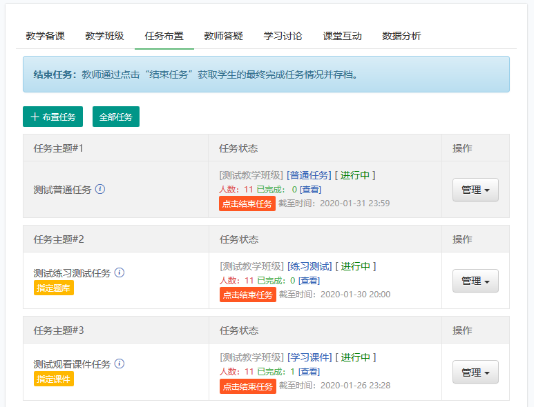 教师可以通过作业任务布置实现学生跟师学习,作业任务包括:主观作业任务、课件学习任务、主题讨论任务、练习测试任务。作业任务结束后,教师可以对学生进行打分。所有作业任务的平均分即为学生的作业任务最终得分。作业任务如下图所示: