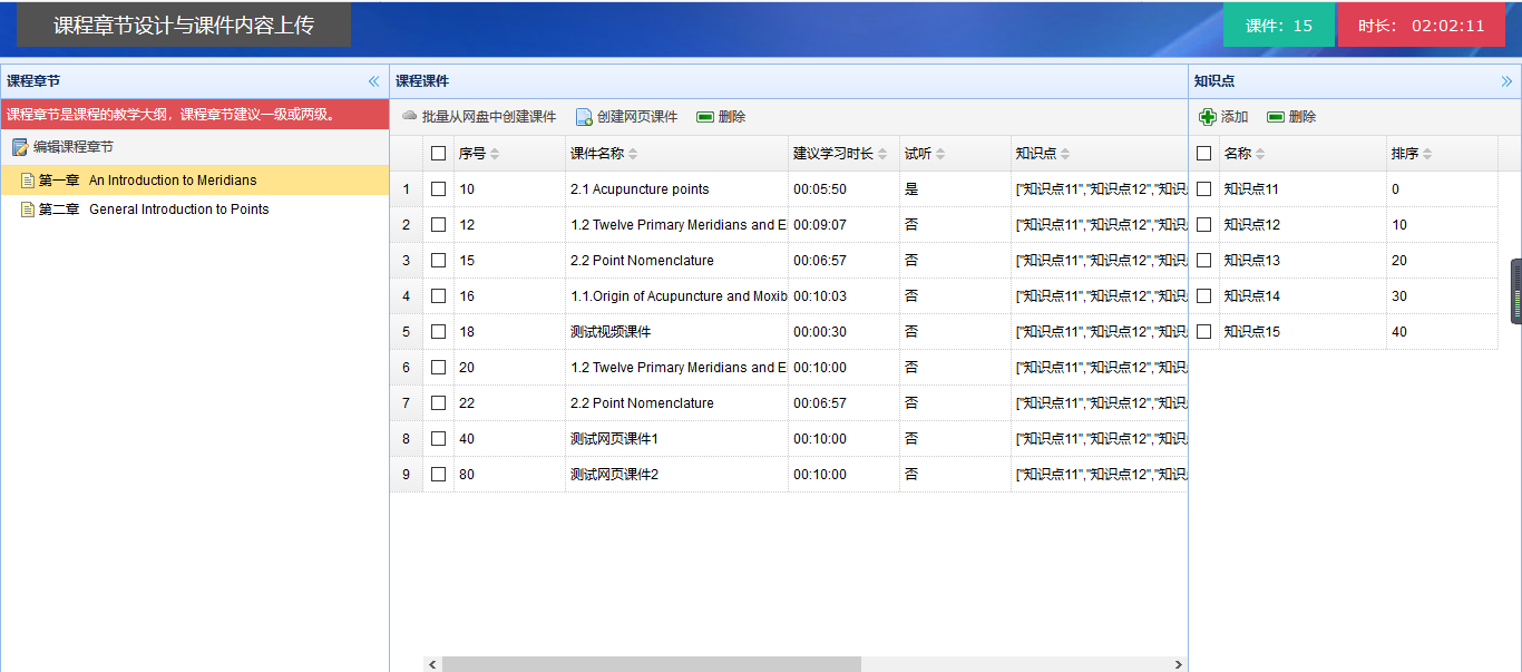 在备课模块下,教师可以进行章节设计,并在章节下创建知识点。知识点同时也是题库中的考点,知识点作为知识点掌握度和学习推荐的核心数据,请仔细编辑。如下图所示: