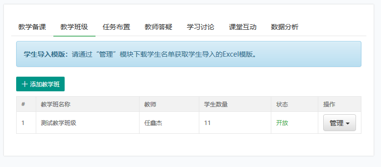 教师完成课程备课后,通过开通教学班级并导入学生名单进行开课。教师可以开通多个教学班级进行教学。导入的学生名单后,学生就可以在学习界面查看到该课程。教学班级如下图所示: