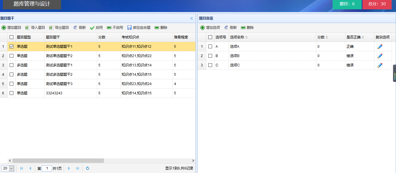 目前题库支持单选题、多选题、是非题、组合题、主观题等,题库的编辑界面如下图所示: