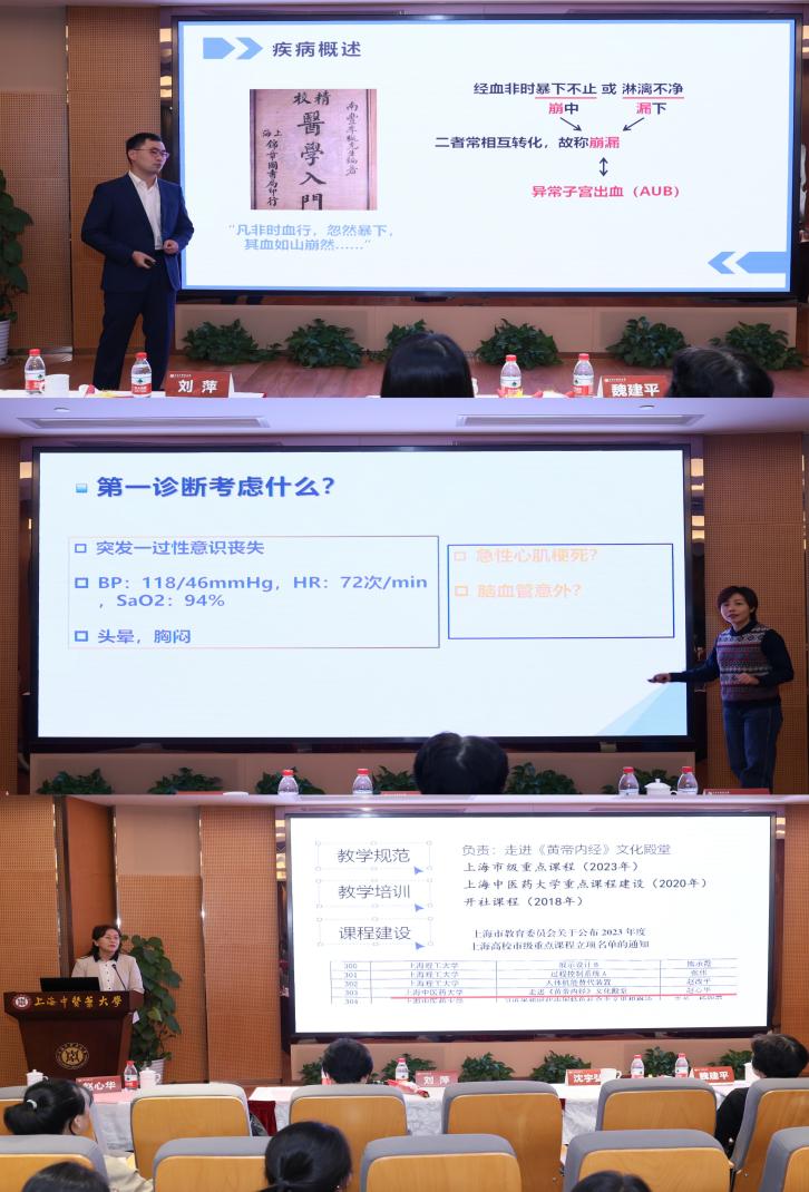 在教学展示和教学设计分享环节,龙华医院陈逸嘉做了中医妇科学崩漏的节段展示,并分享他对课程中如何融入中医思维的思考;龙华医院屠亦文做了中医急诊学心源性晕厥的节段展示,分享她参加教学竞赛以来的心路历程;中医学院赵心华分享整体观导向的《内经选读》课程思政教学设计,结合自身经历,从课程思政的角度谈了自己对于思政如何融入教学的体会。校督导专家魏建平教授作了点评和总结,充分肯定临床中青年教师的热情和付出,并提出建设性的思考和殷切的期望。