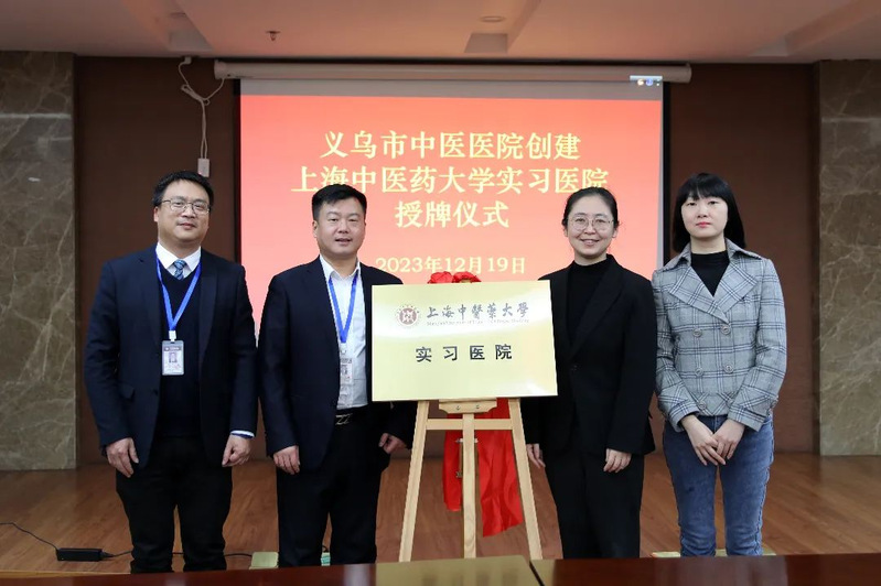 会上,张亭立、沈宇弘、王利健、张文斌共同为上海中医药大学义乌市中医医院实习医院揭牌。
